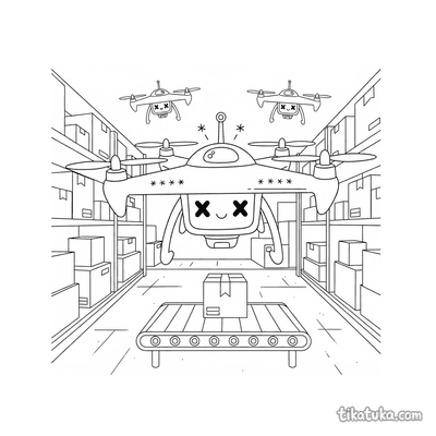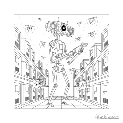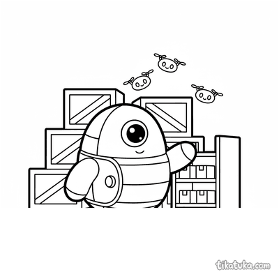 With 152 pages in this section, the robots category covers an impressive variety of scenarios and machine personalities. Delivery bots zip around on monowheels or flying saucers, asteroid mining robots sort space rocks on distant planetoids, and modular robots assemble themselves from scattered parts. More grounded scenes include a robot dog fetching a stick in a park, a tiny robot building a card tower, and a mechanical dragonfly perched on a rusted gear in a junkyard. Every page uses clean, well-defined outlines that clearly separate the robot from its environment, keeping the scene readable even in complex compositions.
