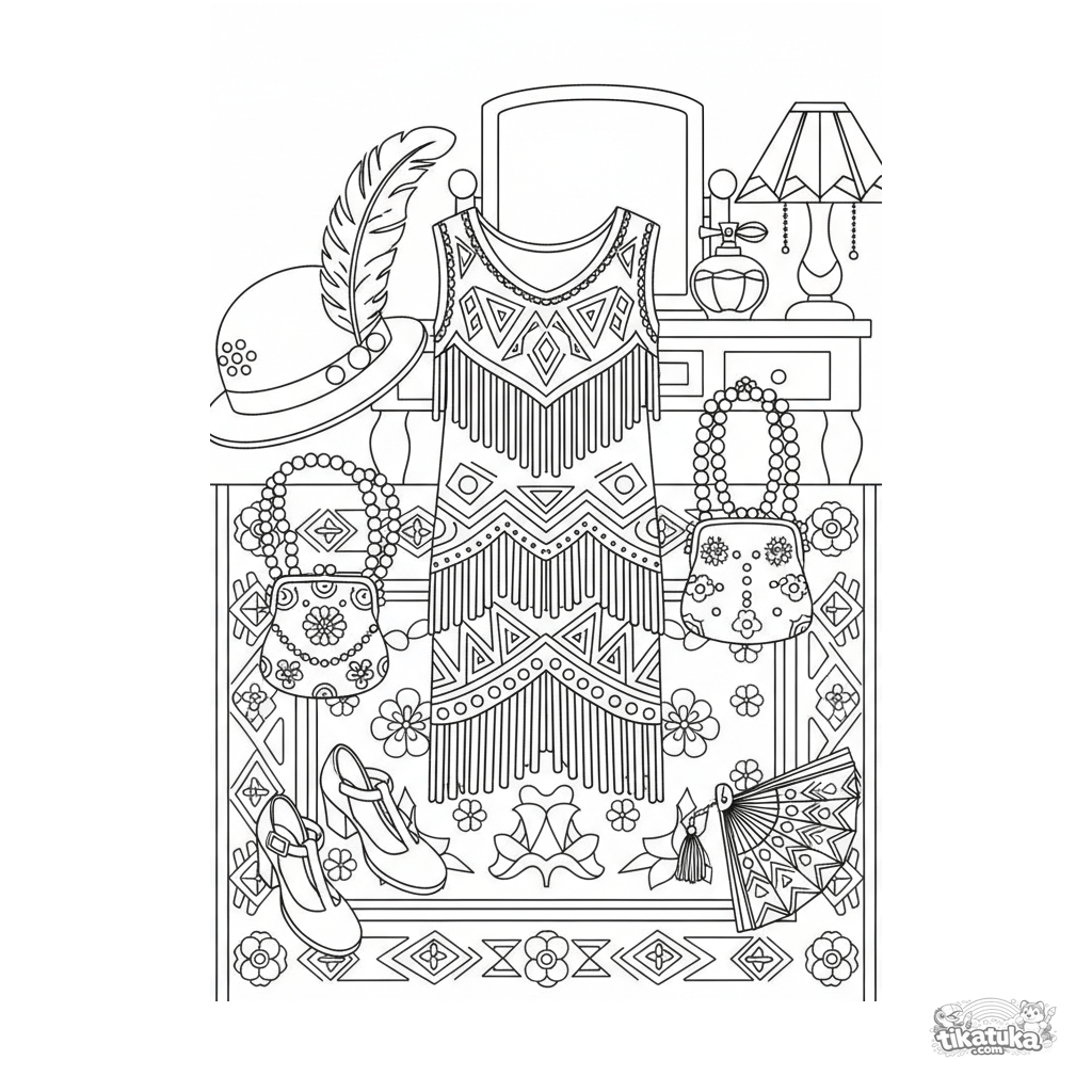Detailed coloring page for girls 10-12: a complete 1920s flapper outfit laid out in a vintage bedroom. Multiple accessories, patterns, and textures to color.