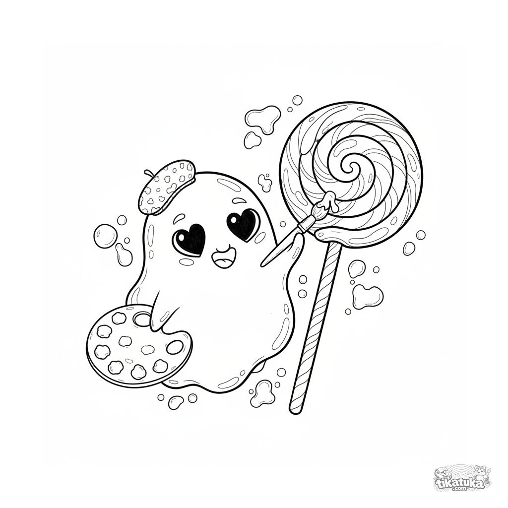 Detailed coloring page for older kids 10-12: an amoeba microbe painter creates art on a crystal lollipop surface. Intricate scene in a watercolor-sketch style, inspiring mood.