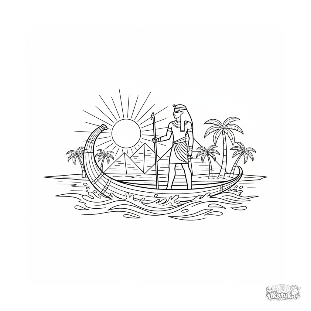 Coloring page for tweens 7-9: an Ancient Egyptian reed boat sailing on the Nile at sunset. Detailed scene with pyramids, in a vintage engraving style.