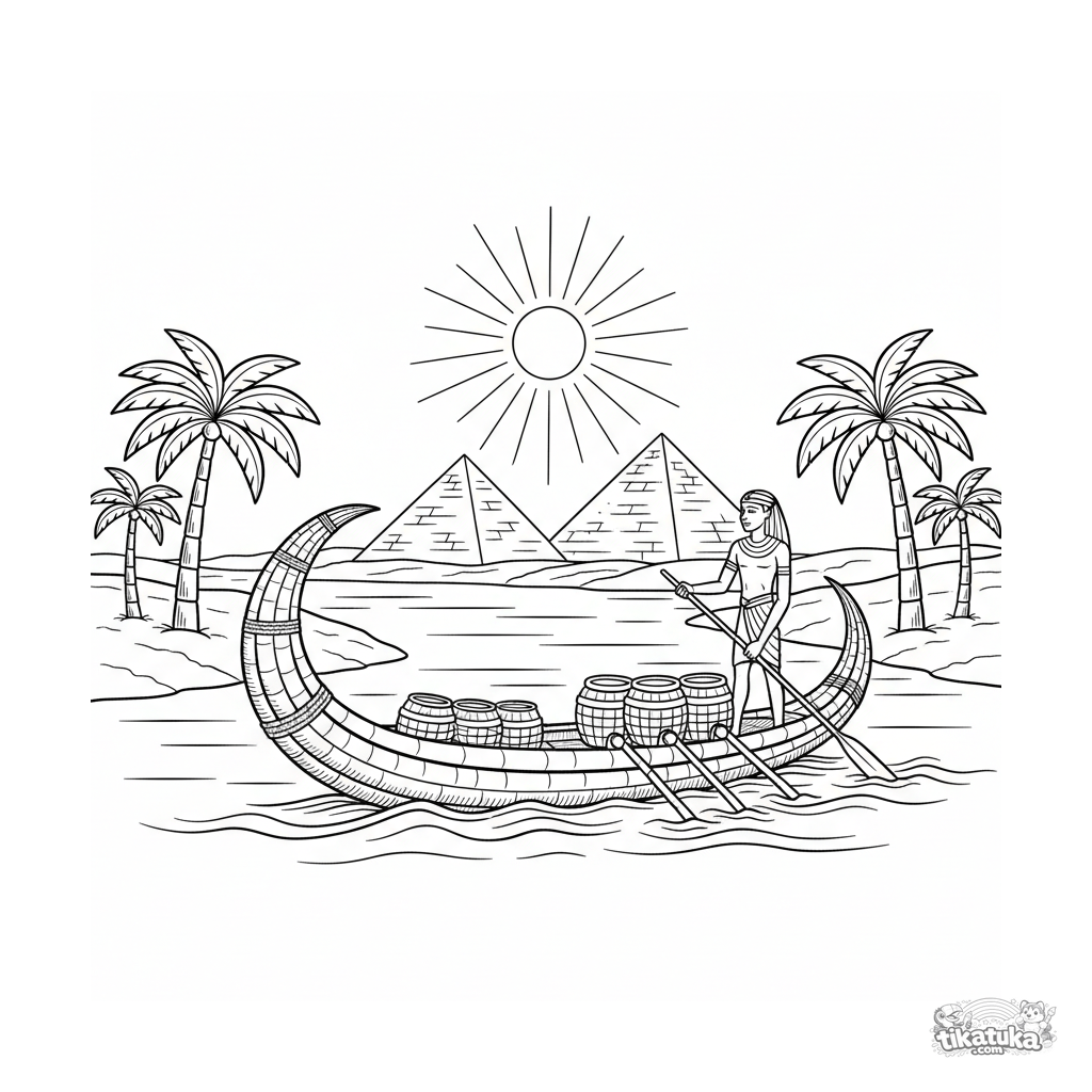 Coloring page for tweens 7-9: an ancient Egyptian reed boat sails the Nile. Pyramids, palm trees, and historical details create an educational scene to color.