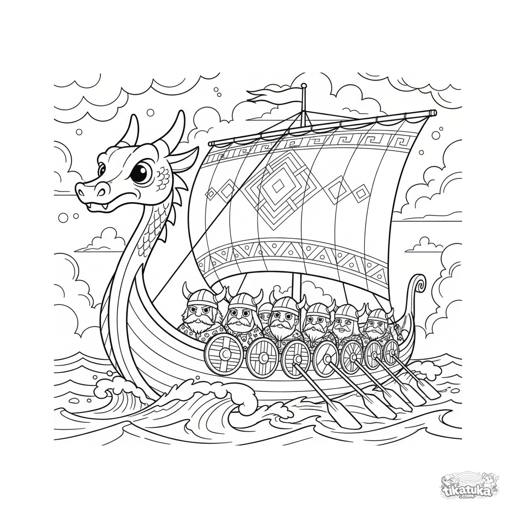 Detailed coloring page for older kids 10-12: an ancient Viking longship with a dragon prow sails a stormy Nordic sea. Warriors row, shields on the side, a dynamic, intricate scene.