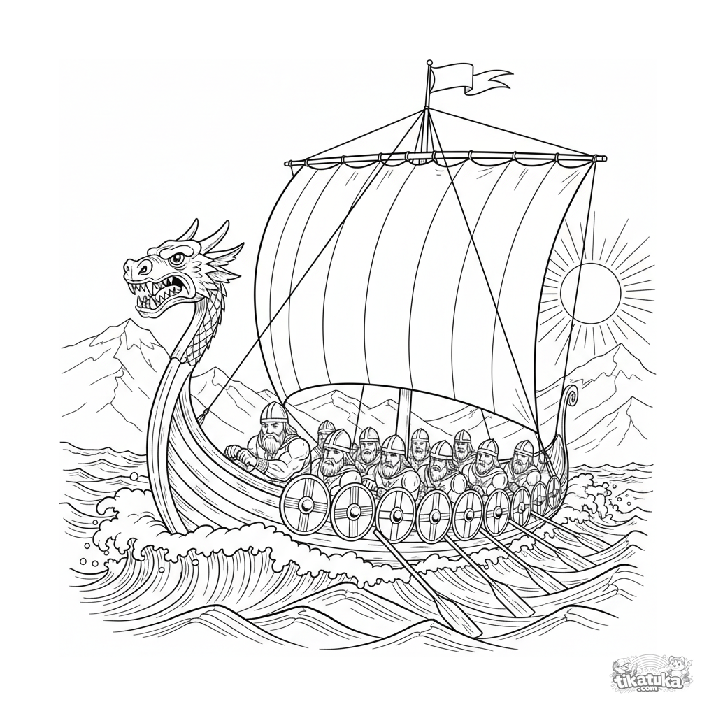Coloring page for tweens 7-9: a Viking longship with a dragon prow sails on a choppy sea. Warriors row, shields line the sides. Dynamic adventure scene.