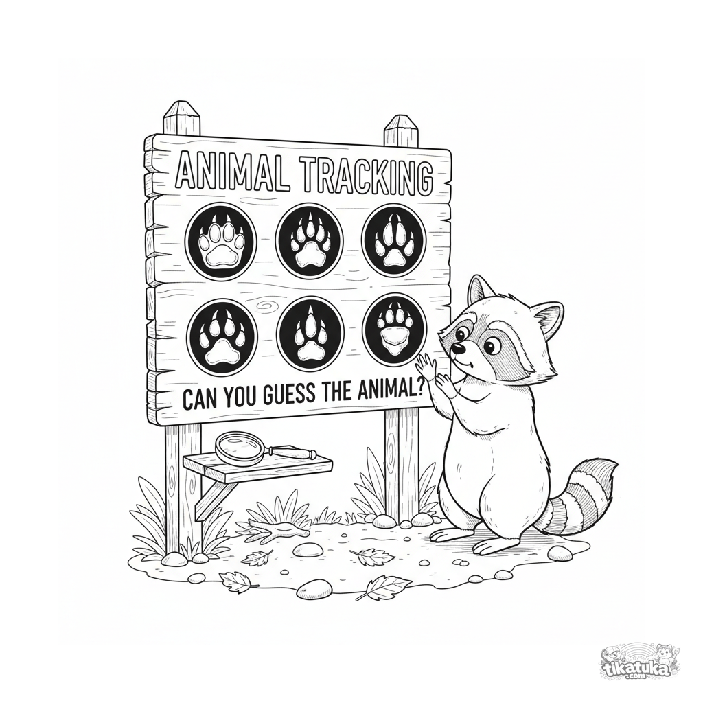 Coloring page for kids 10-12: a detailed animal footprint identification sign at the zoo. A curious raccoon studies the imprints with a magnifying glass. Scene teaches nature observation.
