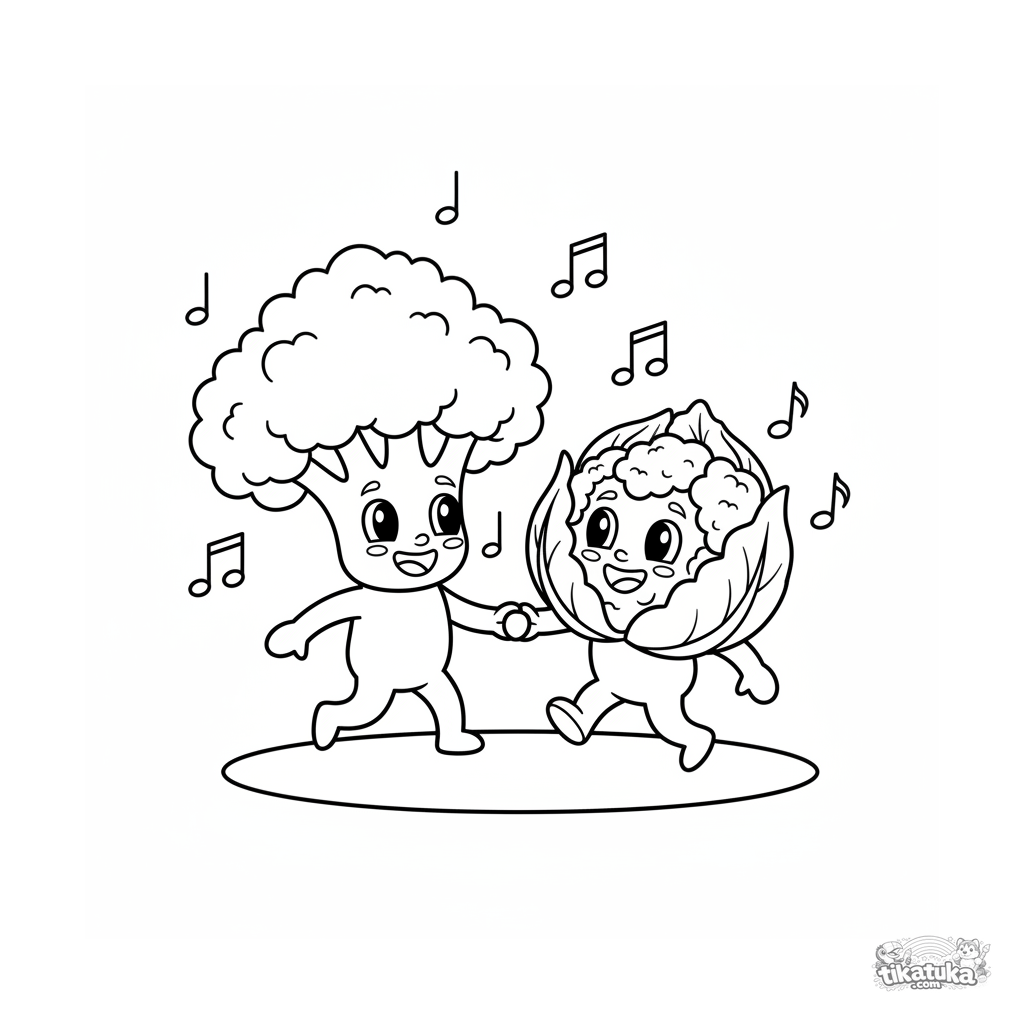 Coloring page of cheerful dancing broccoli and cauliflower characters. For tweens 7-9 years old. Vegetable characters hold hands, with musical notes floating around.