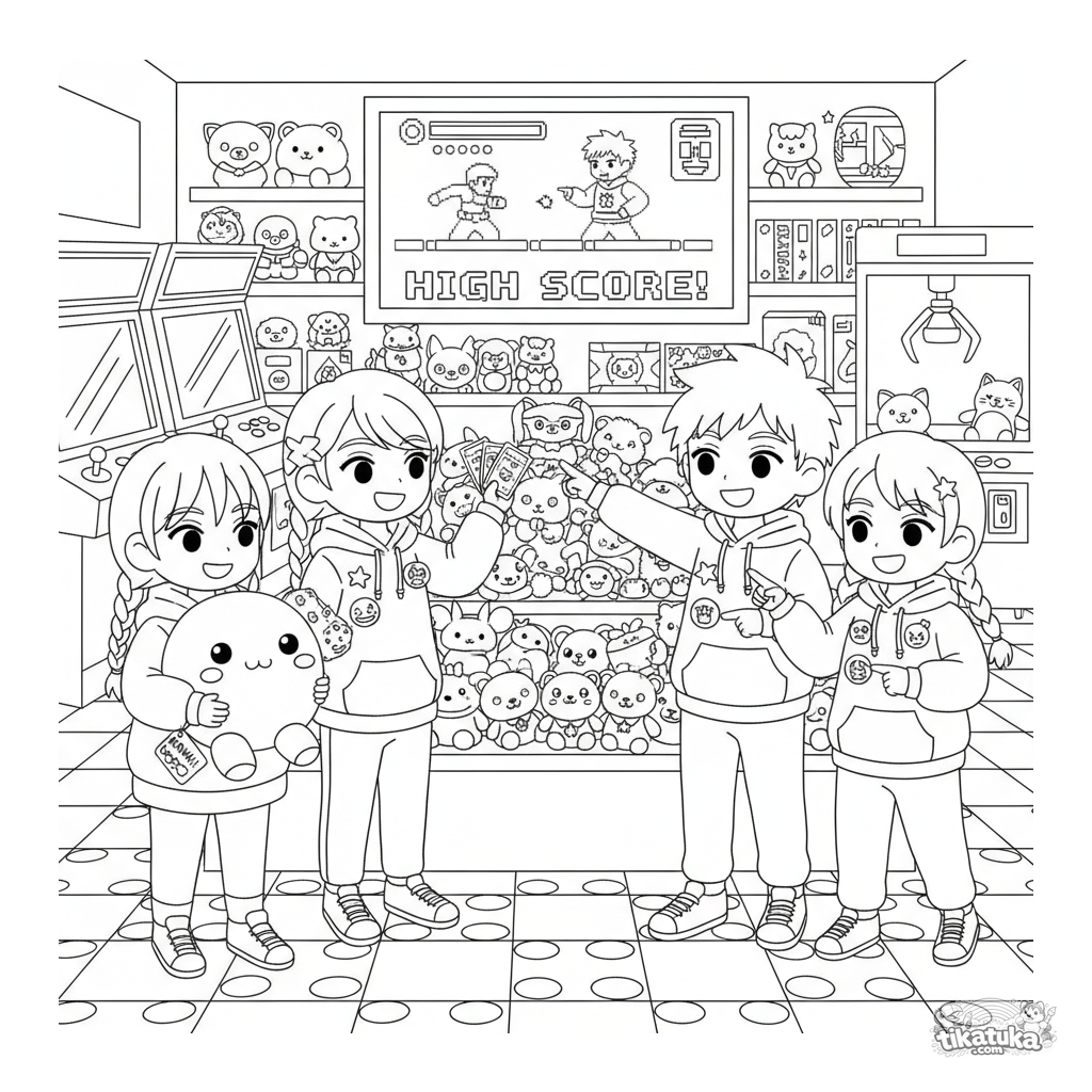 Coloring page for kids 7-12: a group of anime club friends chatting by a prize counter in a bustling arcade. Detailed scene with plush toys, tickets, and game screens.