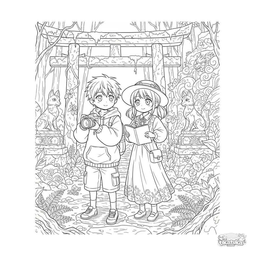 Kodomo anime coloring page: two friends explore an overgrown ancient shrine in a forest. A detailed scene with a torii gate, fox statues, and vines for ages 10-12.