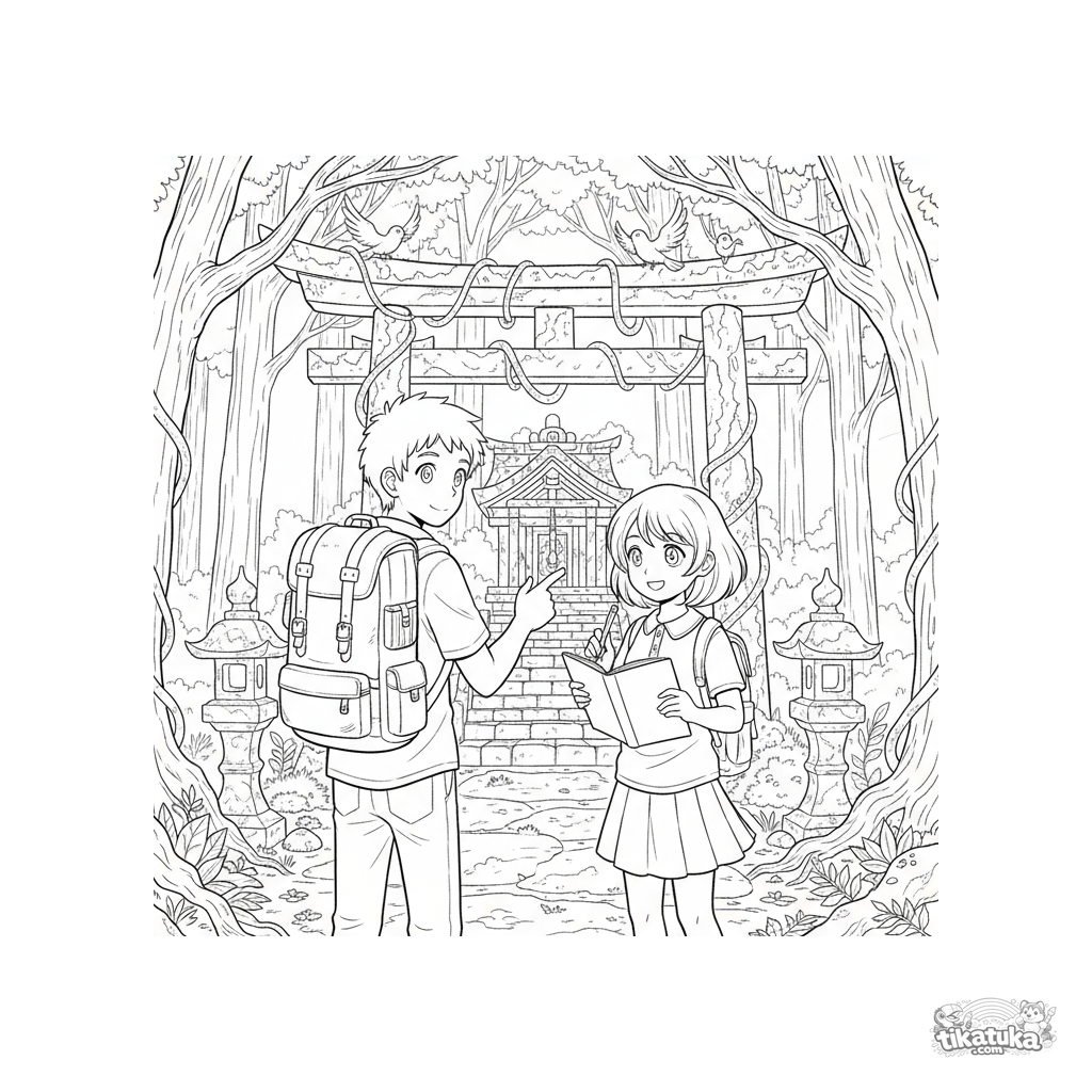 Detailed watercolor-sketch anime coloring page: two friends explore a mossy ancient stone shrine in a forest. Complex background with foliage and light for ages 10-12.