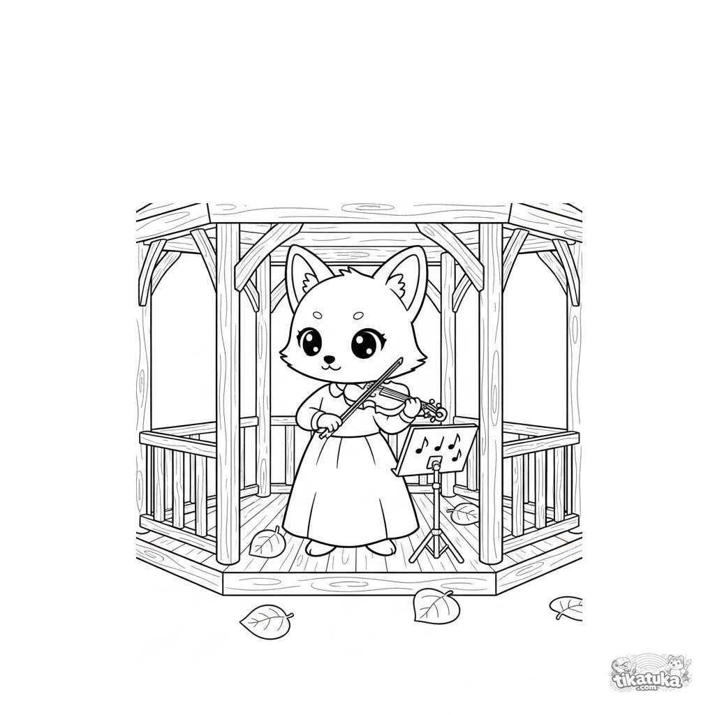 Anime-style coloring page for kids: a fox playing violin in a park gazebo. A peaceful autumn scene with sheet music and fallen leaves.