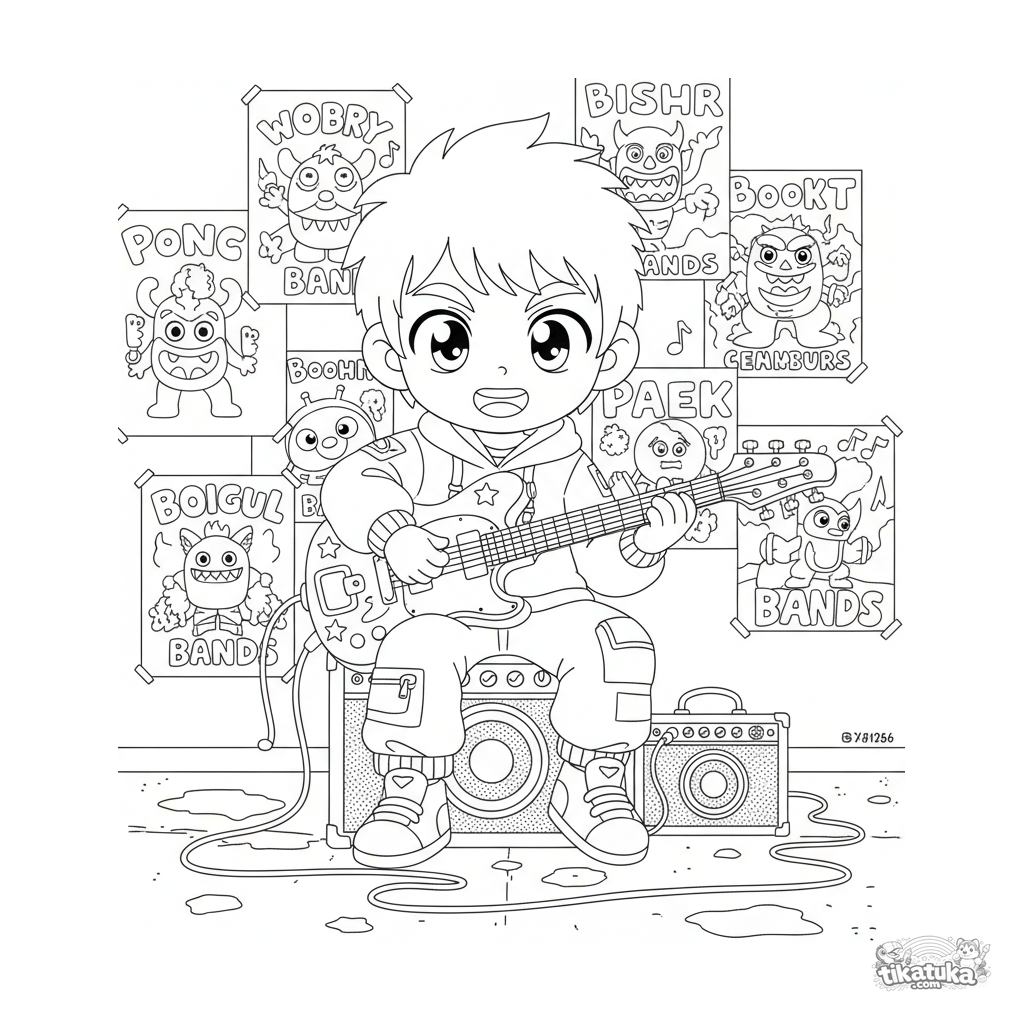 Coloring page for kids 7-11: a boy passionately plays an electric guitar while sitting on an amp in a garage. Detailed anime style with a jam session vibe.