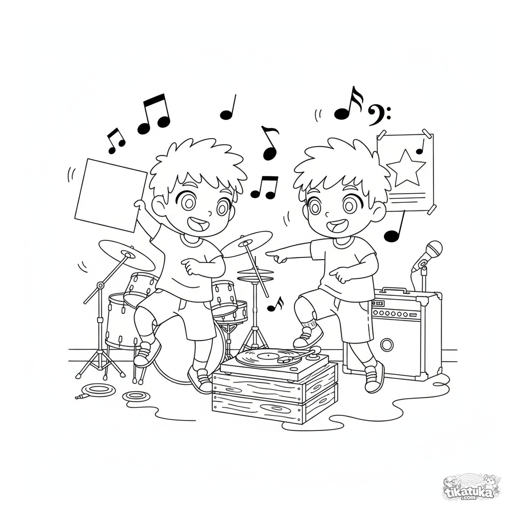 Coloring page for kids 6-9 in anime style: cheerful kids dance in a garage to a vinyl record player. Dynamic scene with notes and a record.