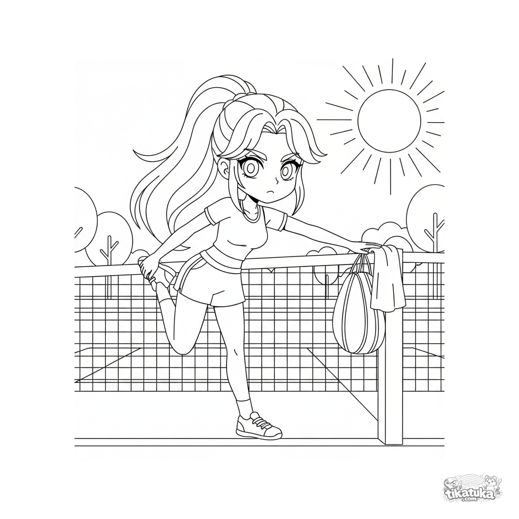 Coloring page for tweens 7-9 in anime style: a tennis player stretches at the net post on court. Dynamic pose, racket bag, and towel.