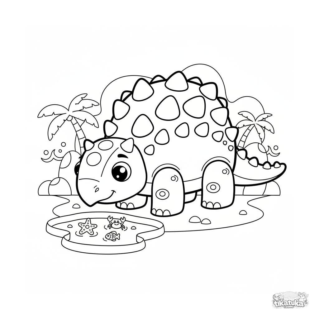 Coloring page for tweens 7-9: an ankylosaurus in wooden-toy style curiously explores a tide pool on the sandy beach of an ancient ocean.