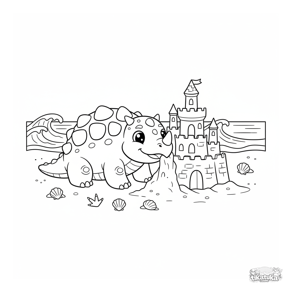 Coloring page for kids 4-6: an ankylosaurus building a sandcastle on an ancient ocean beach. A cute and simple scene for creativity.