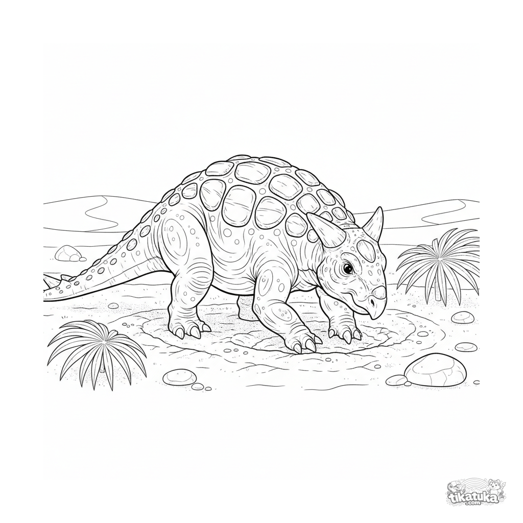 Coloring page for ages 10-12: a detailed ankylosaurus digging a nest in the sand on the shore of an ancient ocean. Realistic proportions, natural scene, high detail level.