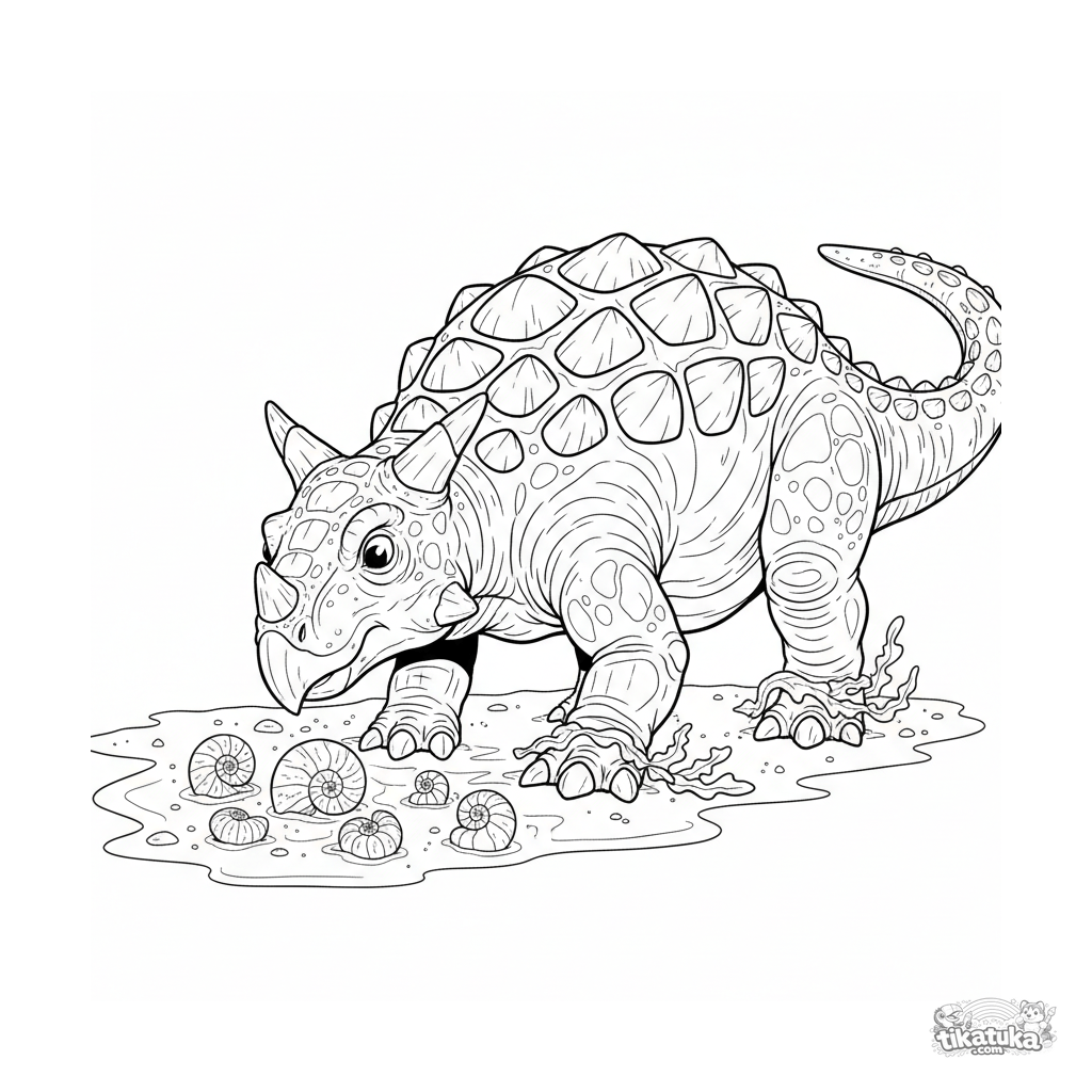Coloring page for ages 10-12: a detailed ankylosaurus digging for shells on the shore of an ancient ocean. A realistic field-guide illustration.