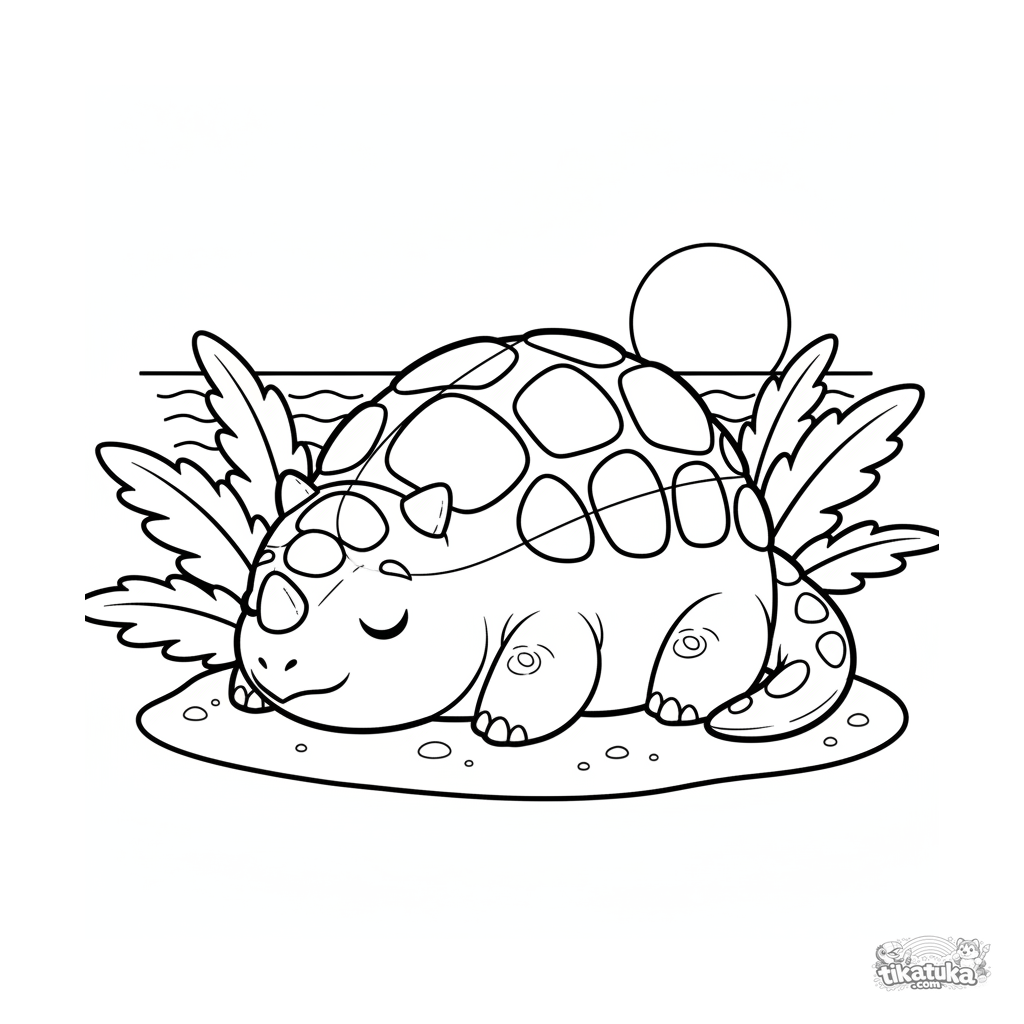 Toddler coloring page ages 2-3: a large, cozy ankylosaurus dozing peacefully on the warm sand of an ancient beach. Simple, large shapes, perfect for first coloring.