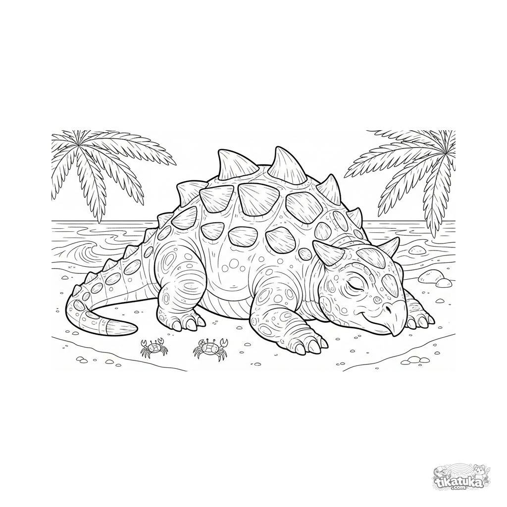 Detailed coloring page for ages 10-12: an ankylosaurus naps peacefully on the sunny sand of an ancient shore. A realistic armored dinosaur illustration for avid colorists.