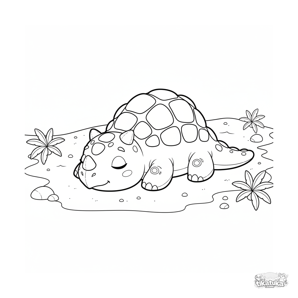 Coloring page of a cozy ankylosaurus sunbathing on the warm sand of an ancient beach. For kids 4-6 years old. Rounded shapes, pleasant scene.