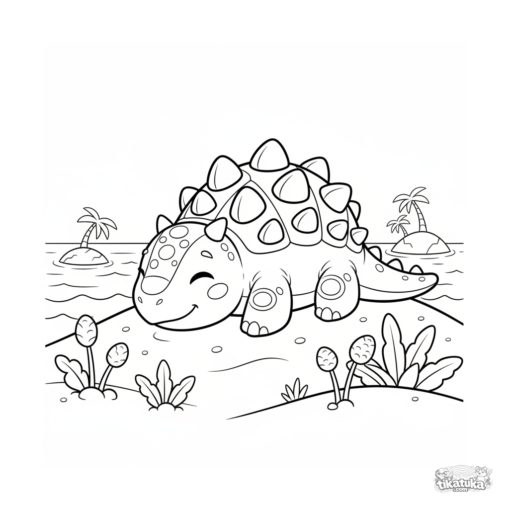 Coloring page for kids 7-9: a plump ankylosaurus basks in the sun on a sandy dune by the ancient ocean. Clear outlines, peaceful scene.