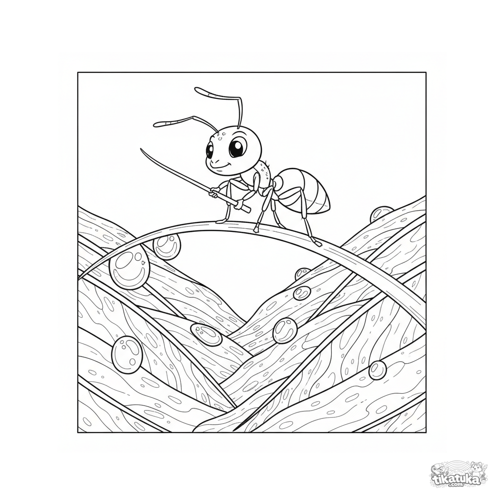 Coloring page for ages 10-12: a tightrope-walking ant crosses a blade of grass between dewdrops on a large leaf. A detailed scene with circus elements.