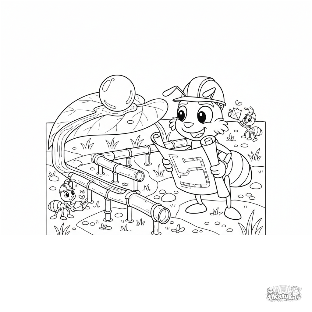 Complex coloring page for ages 10-12: an ant engineer directs the construction of a grass-stem aqueduct for a dewdrop on a leaf. Technical style.