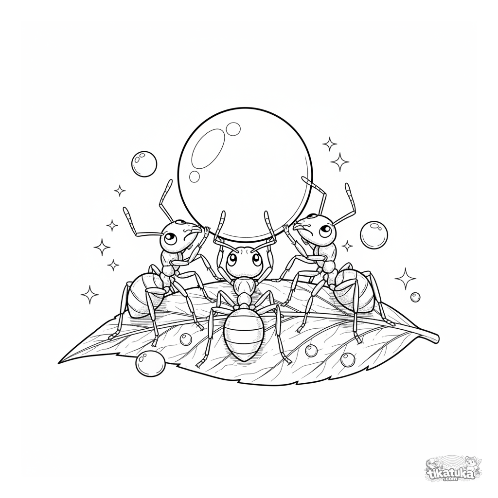 Complex coloring page for ages 10-12: three ants work together to carry a large dewdrop across a leaf surface. A detailed scene of insect interaction.