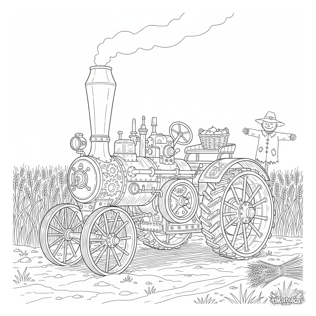 Detailed, realistic-style coloring page of an antique steam tractor in a golden field. A challenging coloring page for kids aged 8-12.