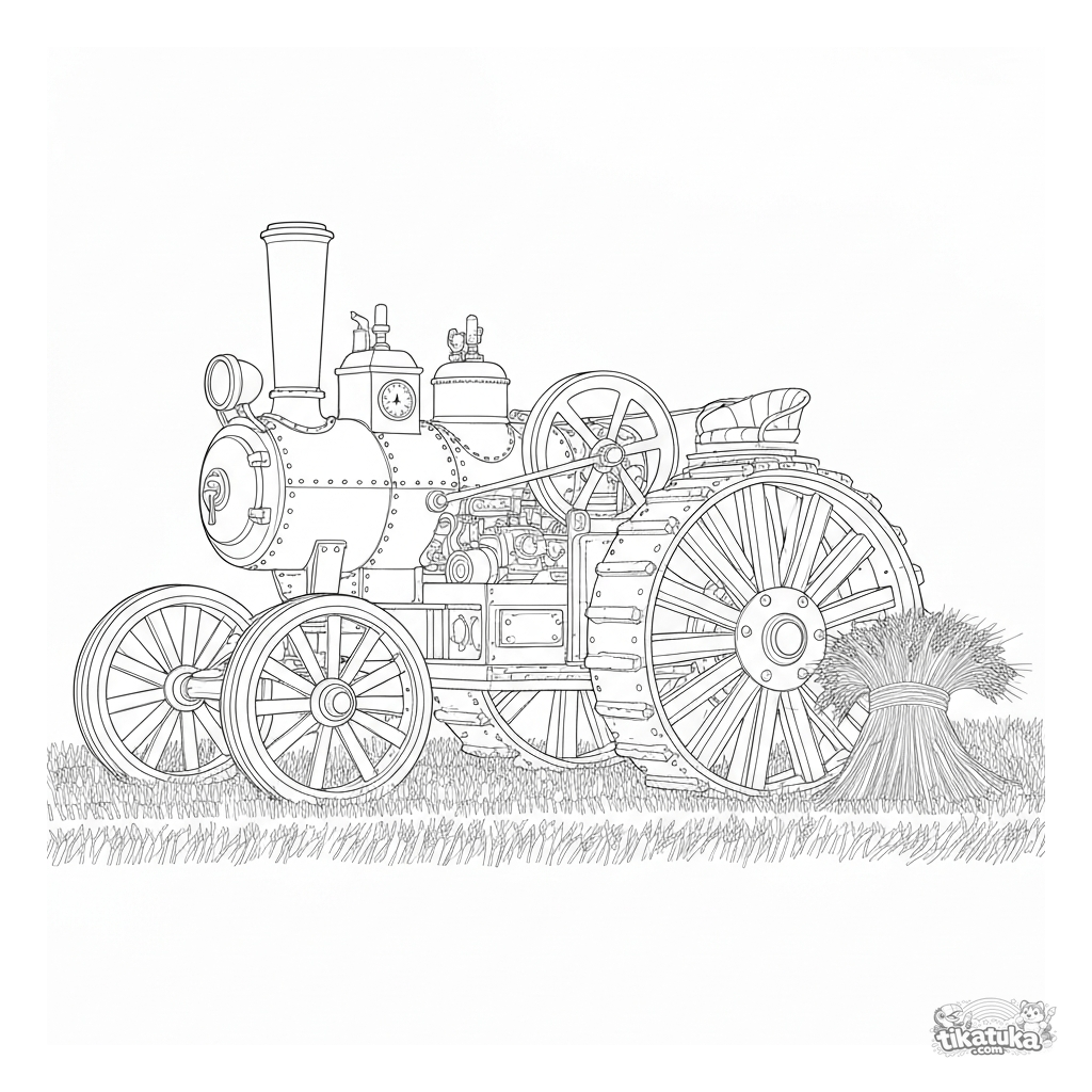 Intricate realistic-style coloring page of a detailed antique steam tractor in a field. For kids aged 8-12. Lots of mechanical details.