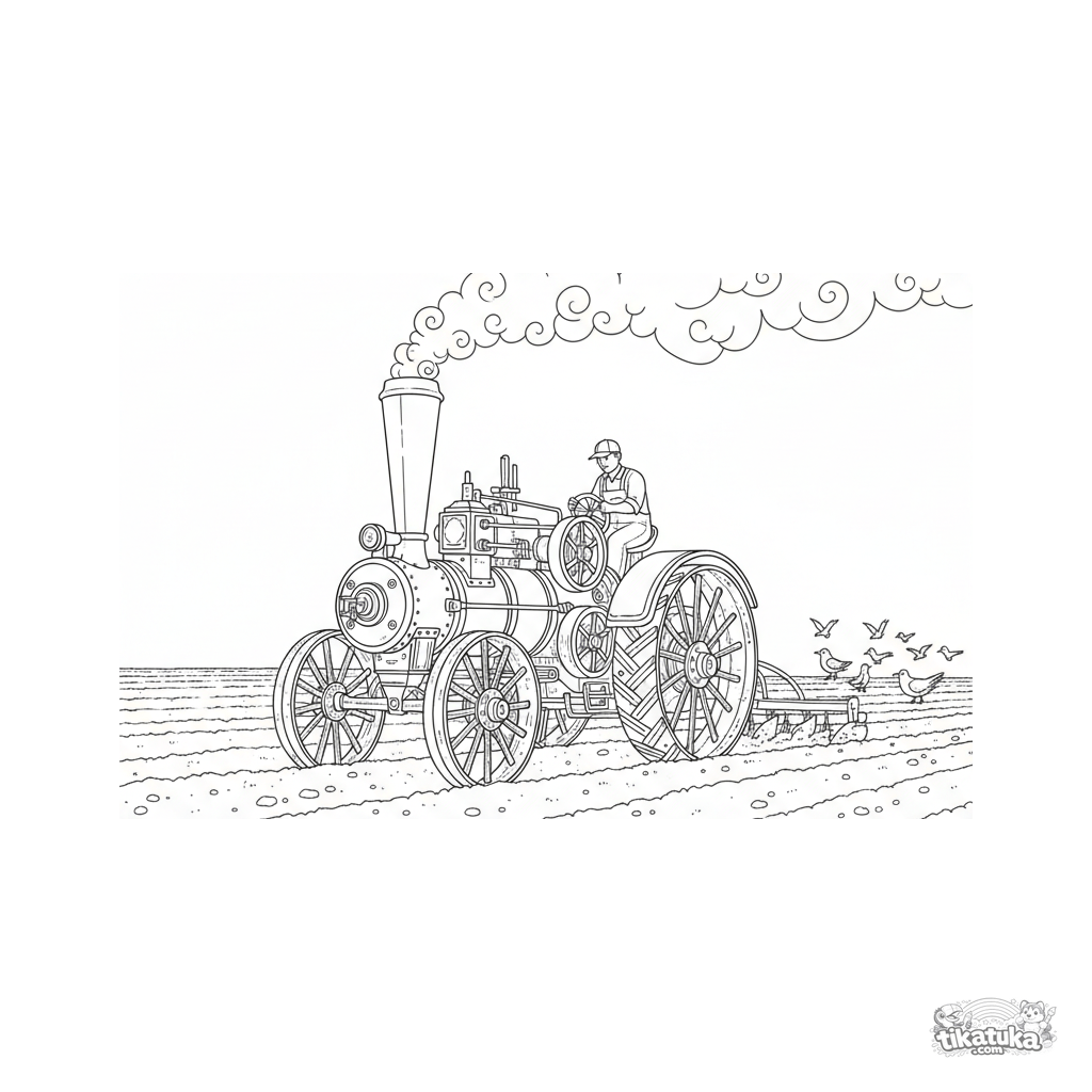 Detailed coloring page of an antique steam tractor with wooden wheels plowing a field. For kids aged 8-12, intricate mechanical details.