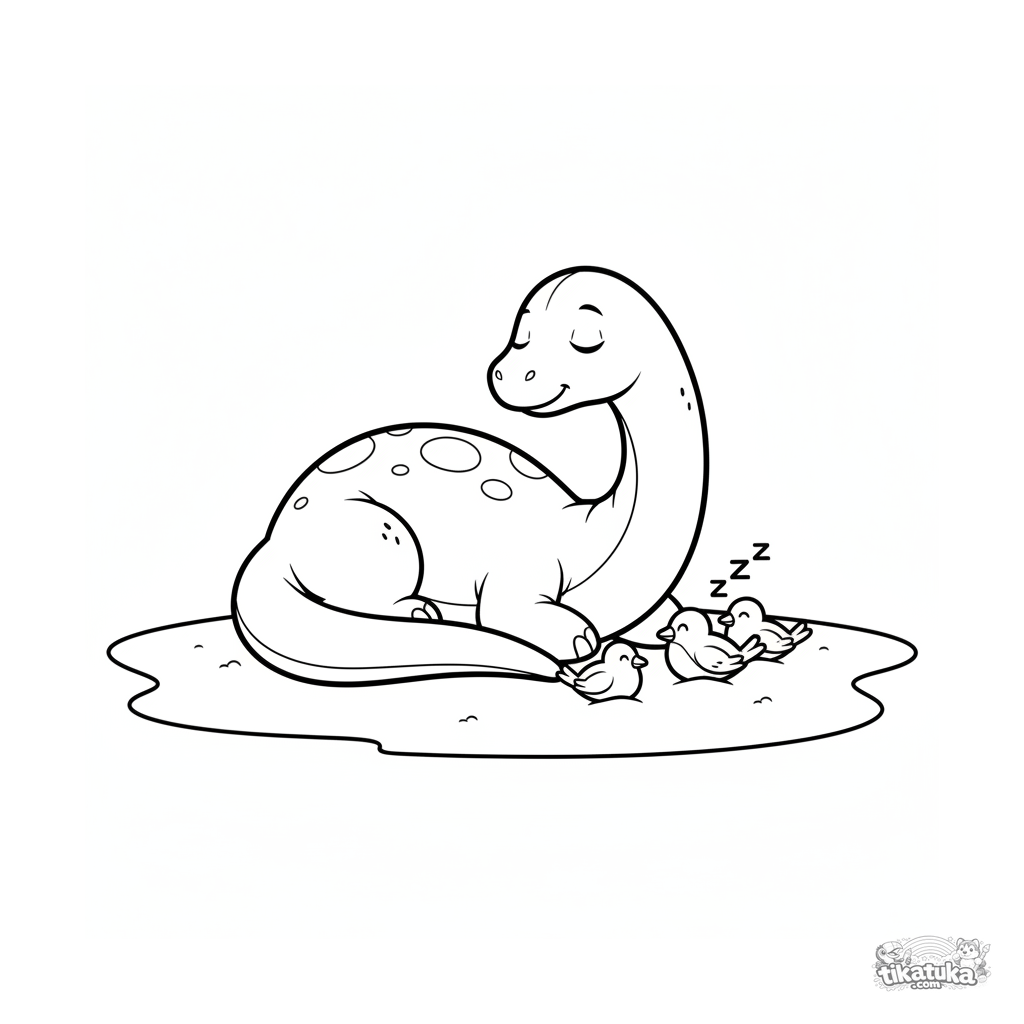 Very simple coloring page for toddlers 2-3 years old: a big friendly apatosaurus sleeps soundly on the warm sand of an ancient beach. Large closed shapes.