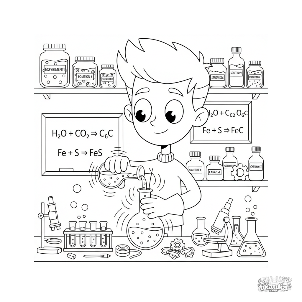 Detailed coloring page for older kids 10-12: an inventor's apprentice in a secret laboratory conducts a chemistry experiment with a glowing formula among flasks and reagents.