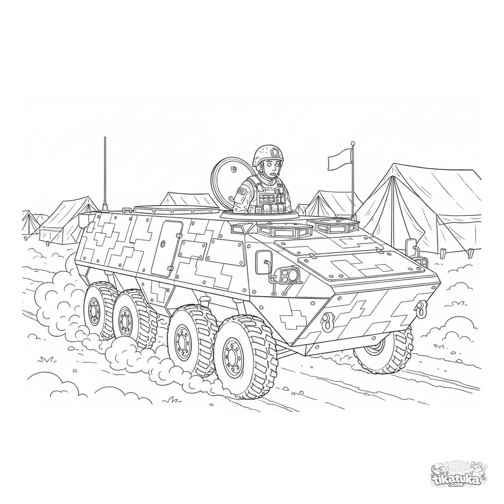 Detailed coloring page for older kids 10-12: a modern armored personnel carrier arrives at the field headquarters. A soldier peers out from the hatch, surveying the tents.