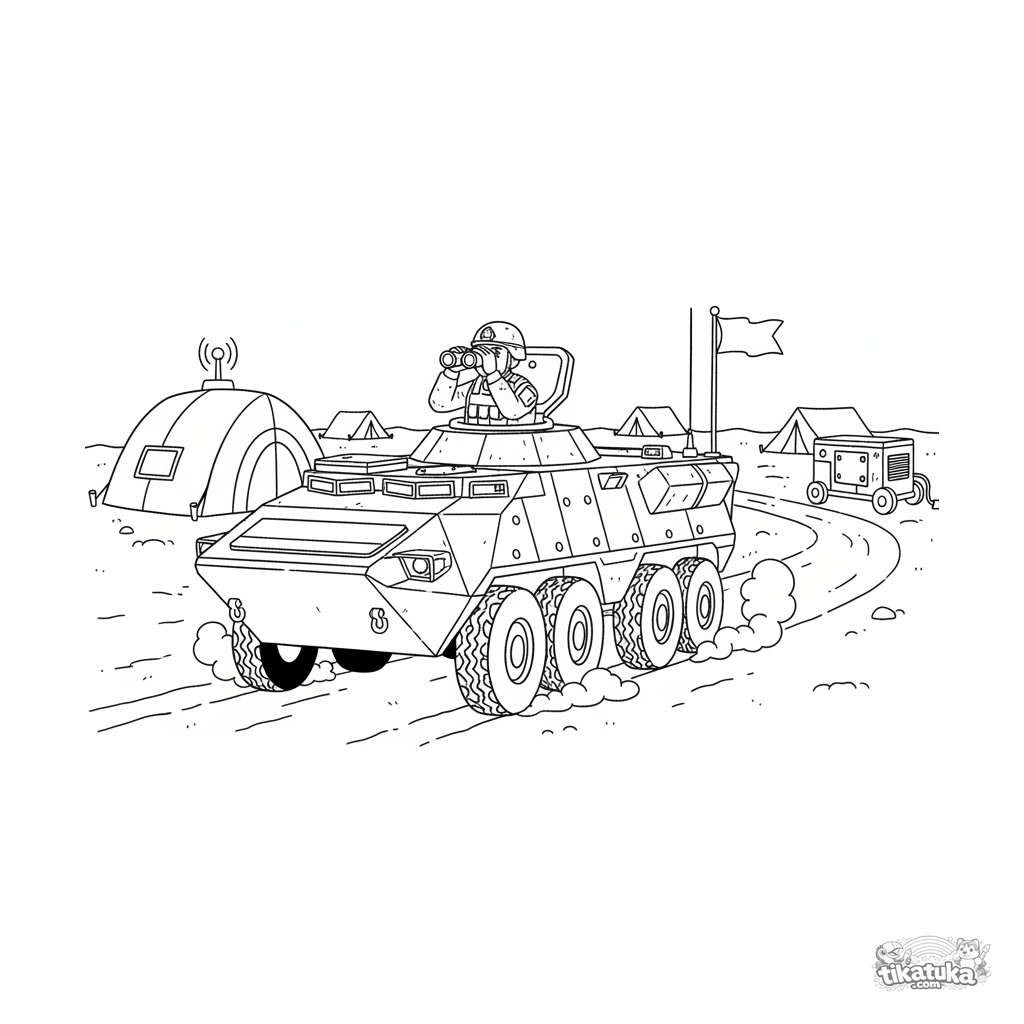 Coloring page for kids 7-9: a modern armored personnel carrier slowly patrolling the perimeter of a field headquarters. A soldier in the hatch is observing with binoculars.