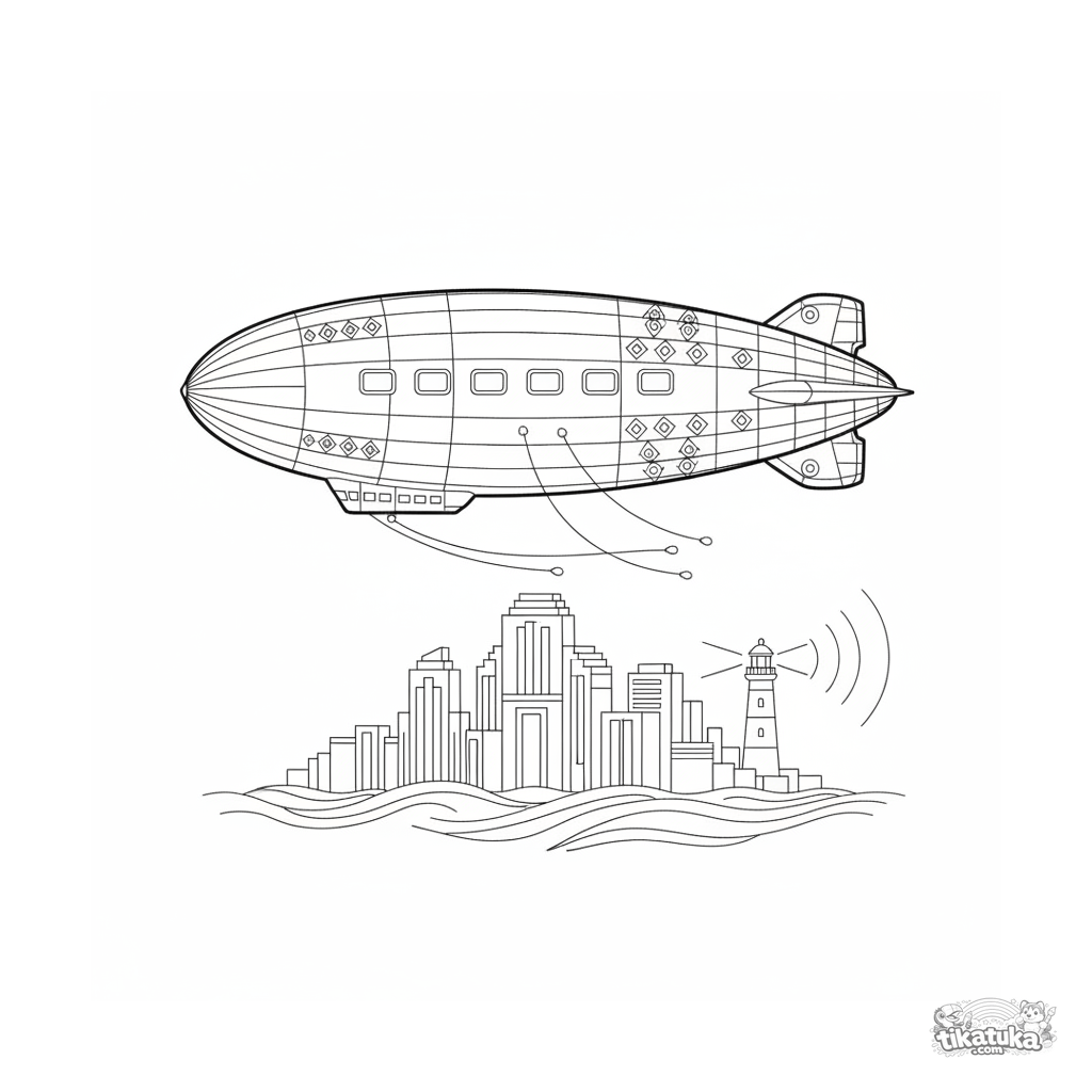 Detailed coloring page of an art deco zeppelin flying over a coastal city at dusk. For ages 10-12. Elegant lines, observation windows, cityscape.