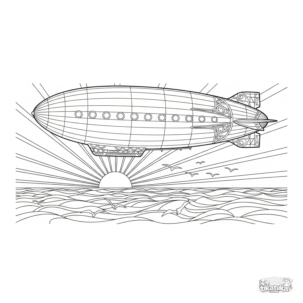 Coloring page for older kids 10-12: a majestic art deco passenger zeppelin from the 1930s glides smoothly over a vast ocean at sunset, with rows of observation windows.
