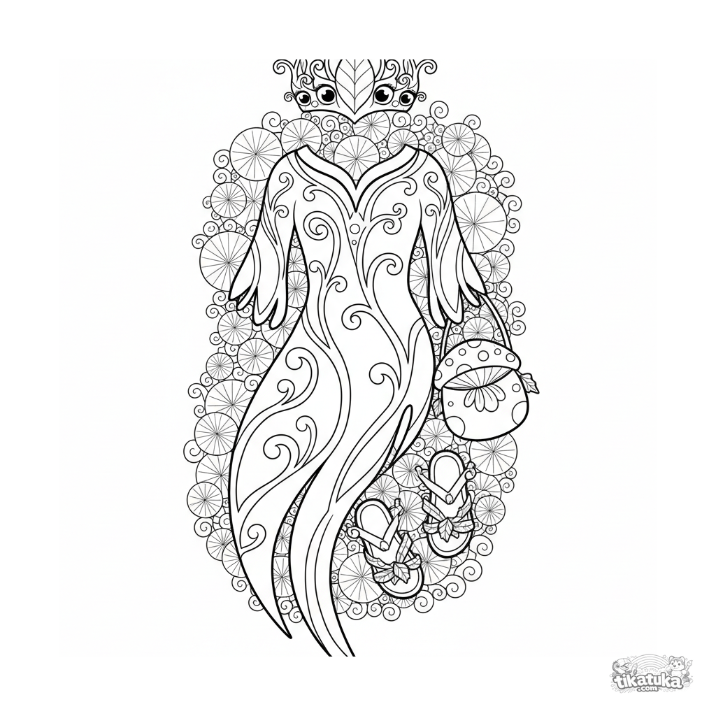 Coloring page for girls 10-12: a detailed flat lay of a fantasy forest sprite tunic outfit in Art Nouveau style, with vine embroidery, leaf crown, and mushroom pouch.