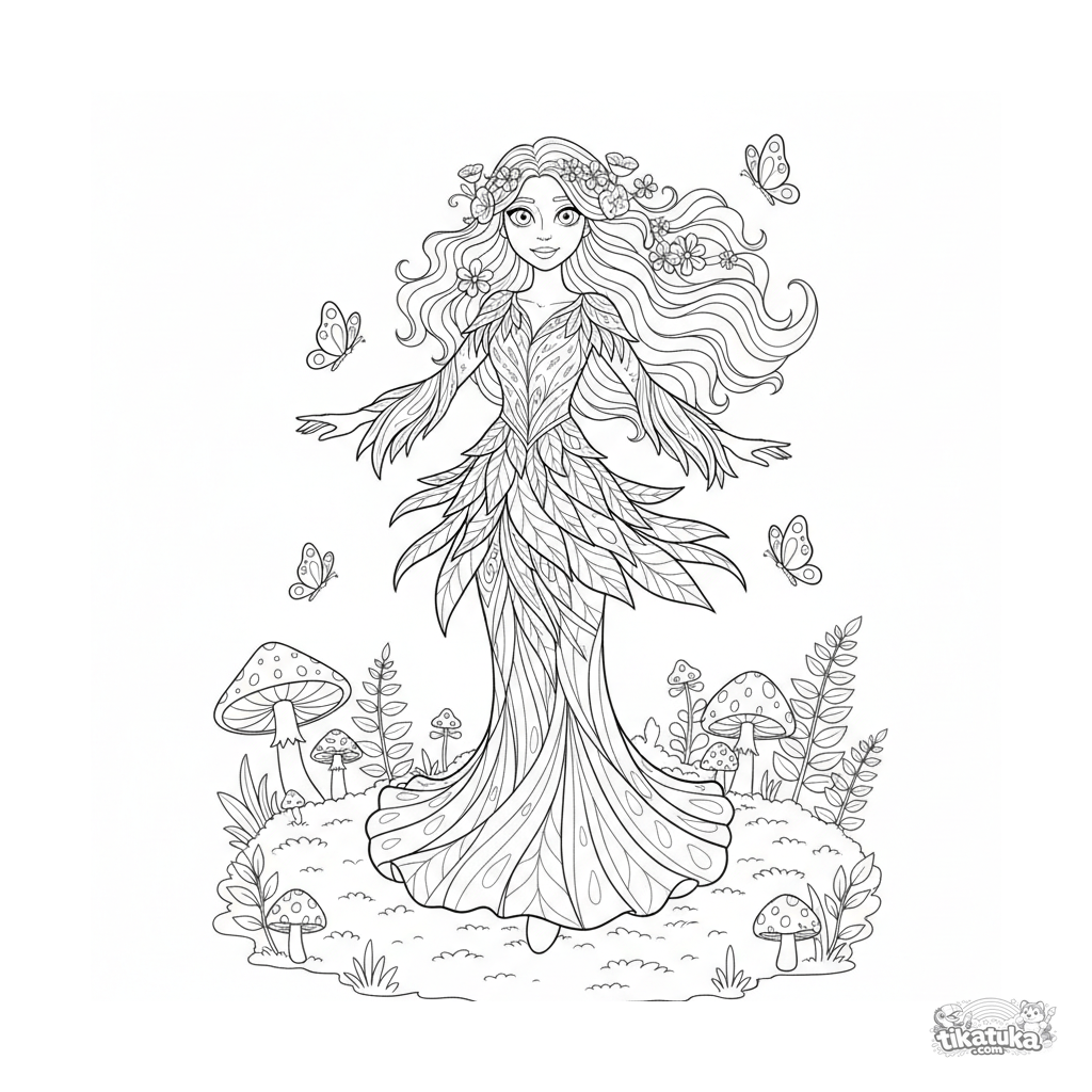 Coloring page for girls 10-12: a forest sprite in a detailed leaf-woven tunic twirls in a magical clearing. Complex art-nouveau-lite scene with butterflies and ferns.