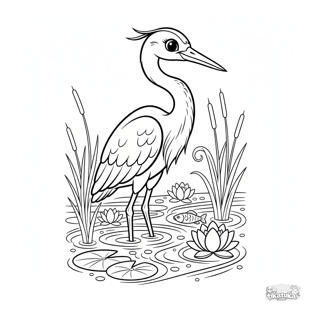 Coloring page for ages 7-9 in art nouveau style: a graceful heron stands in the reeds by a stream. Decorative lines, water lilies, and ripples.
