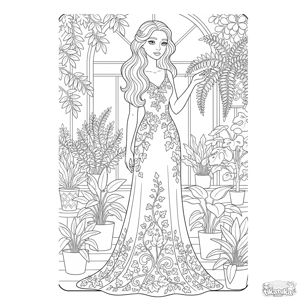 Coloring page for girls 10-12: an elegant Art Nouveau-inspired gown with ivy embroidery in a sunlit conservatory. High detail, realistic line art.