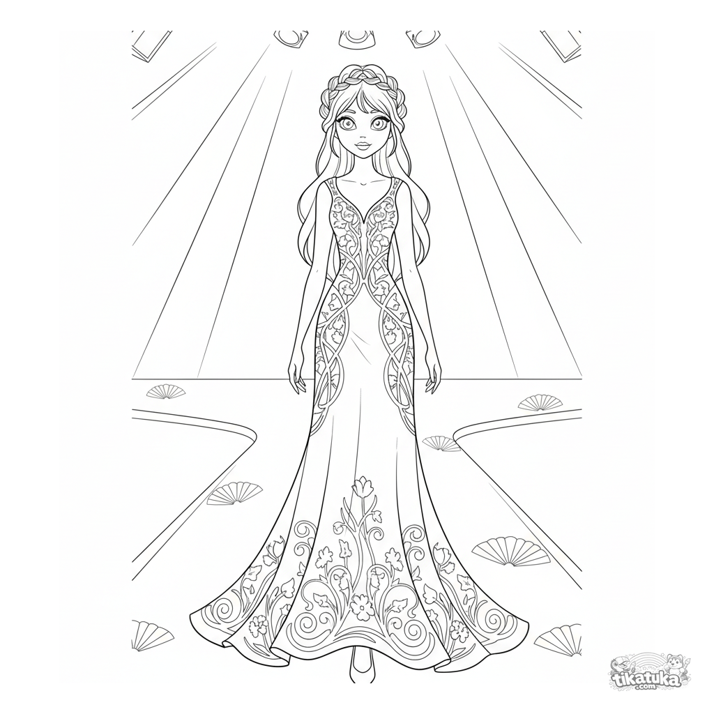 Coloring page for ages 10-12: a model in an Art Nouveau gown with ivy embroidery walks a runway. High detail, historical fantasy style.