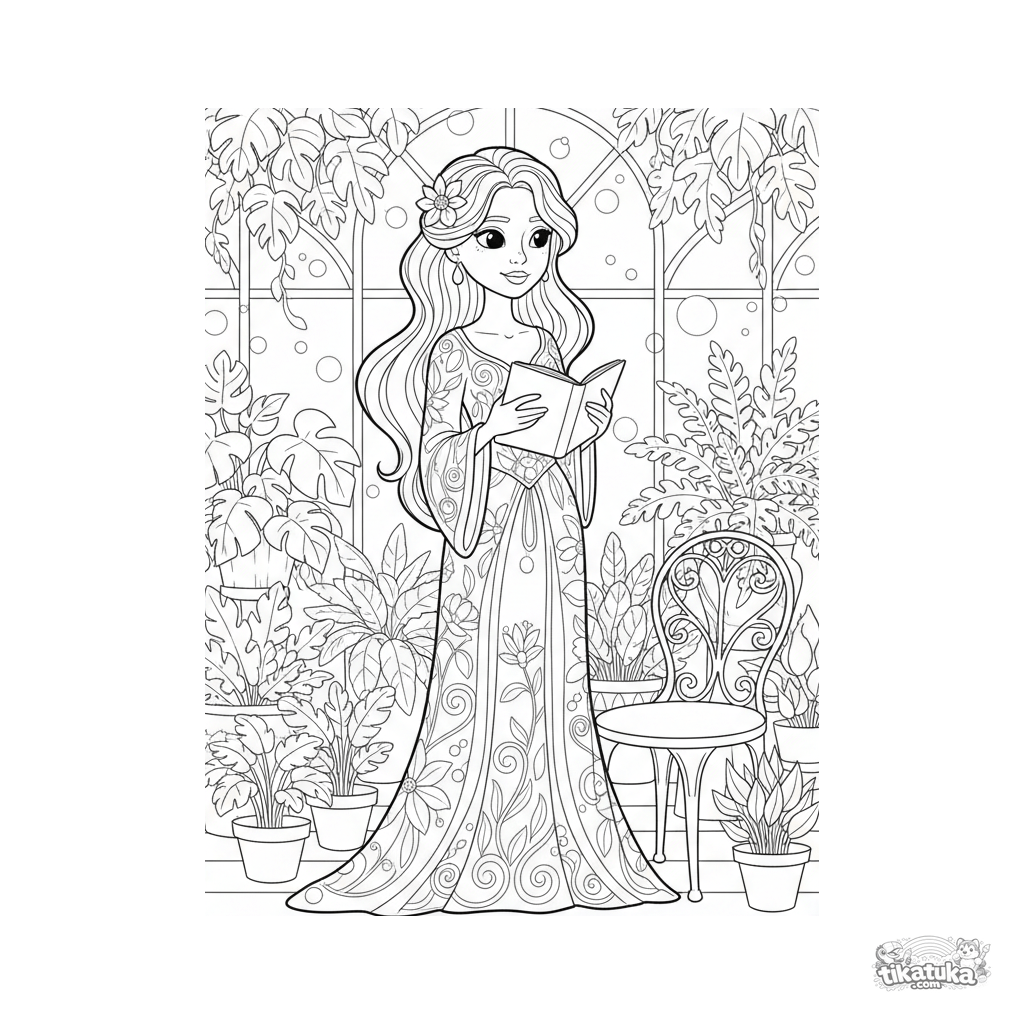 Coloring page for ages 10-12: an Art Nouveau-inspired gown with floral embroidery. A figure in a conservatory with a sketchbook. High-detail line art with organic, flowing patterns.
