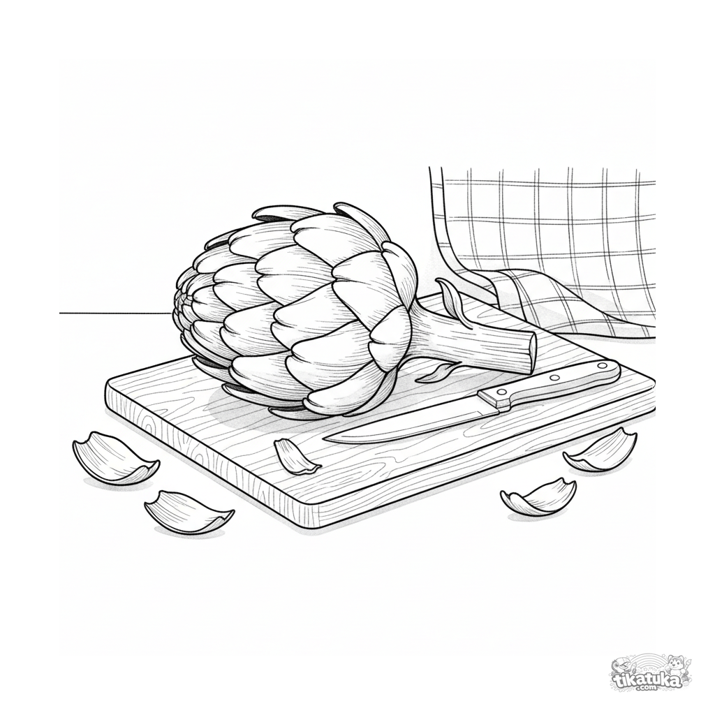 Detailed coloring page of an artichoke on a cutting board in a kitchen. For kids 10-12. Realistic watercolor-sketch style, textures, kitchen still life.