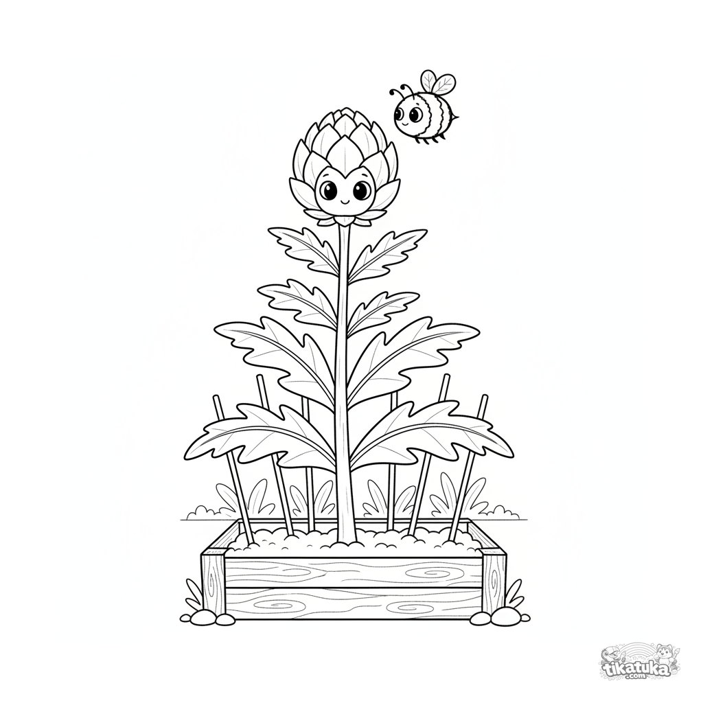 Coloring page for ages 7-9: an artichoke grows in a raised garden bed with a bumblebee visitor. Moderate detail, watercolor-sketch style.