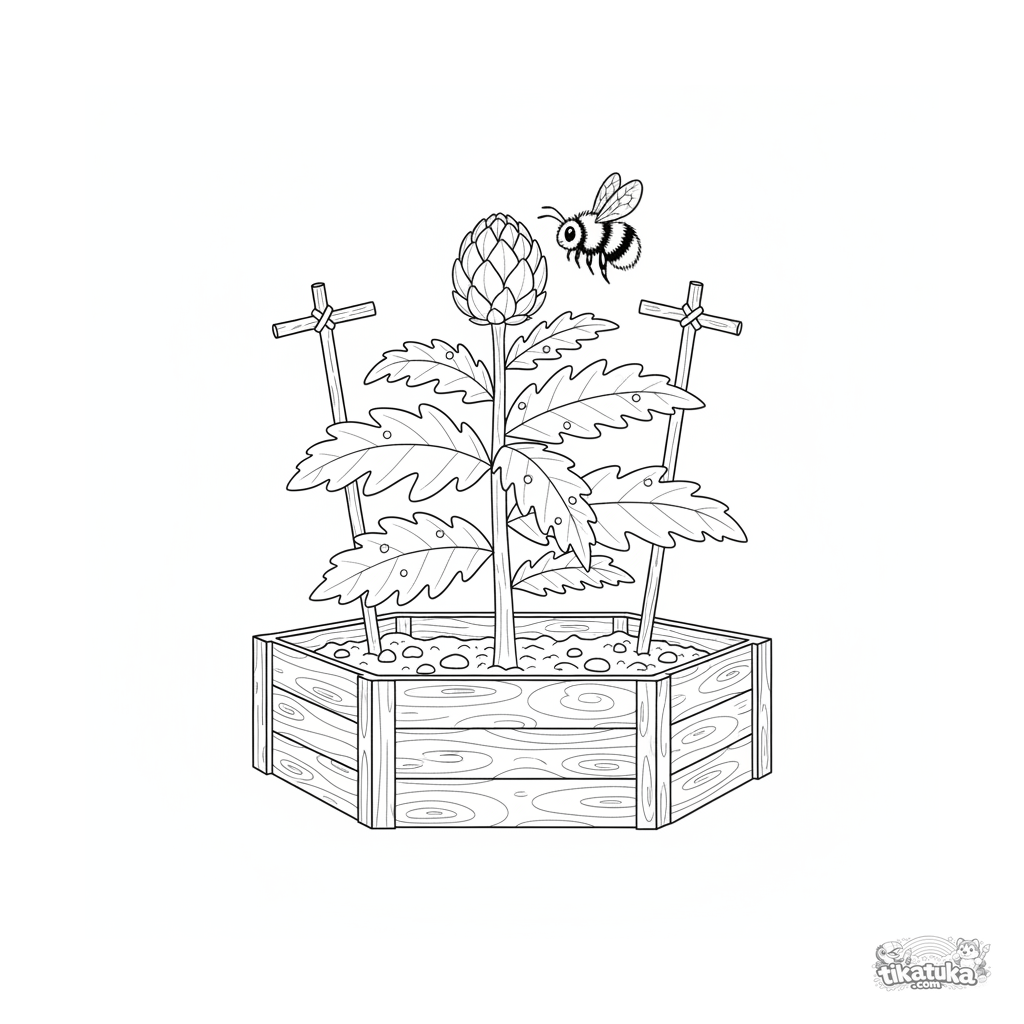 Coloring page for kids 4-6: an artichoke plant growing in a garden bed with dewdrops and a bumblebee. Clear outlines, moderate detail, educational theme.