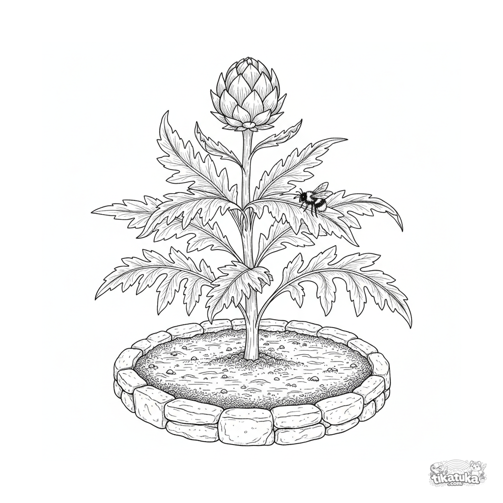 Realistic coloring page of an artichoke growing in a stone garden. For older kids 10-12. Detailed plant with a visiting bee.