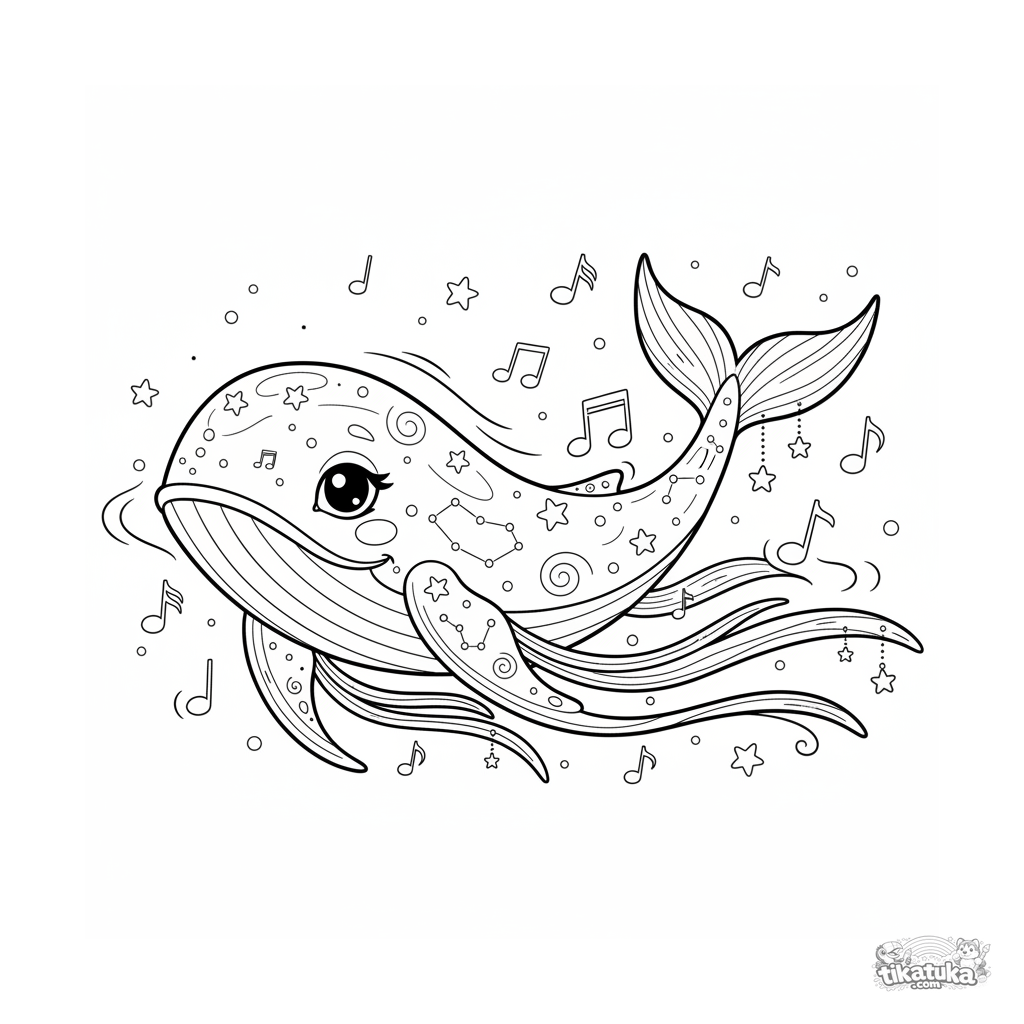 Detailed coloring page for older kids 10-12: a graceful astral whale with a starry body swims through a sea filled with floating music notes.