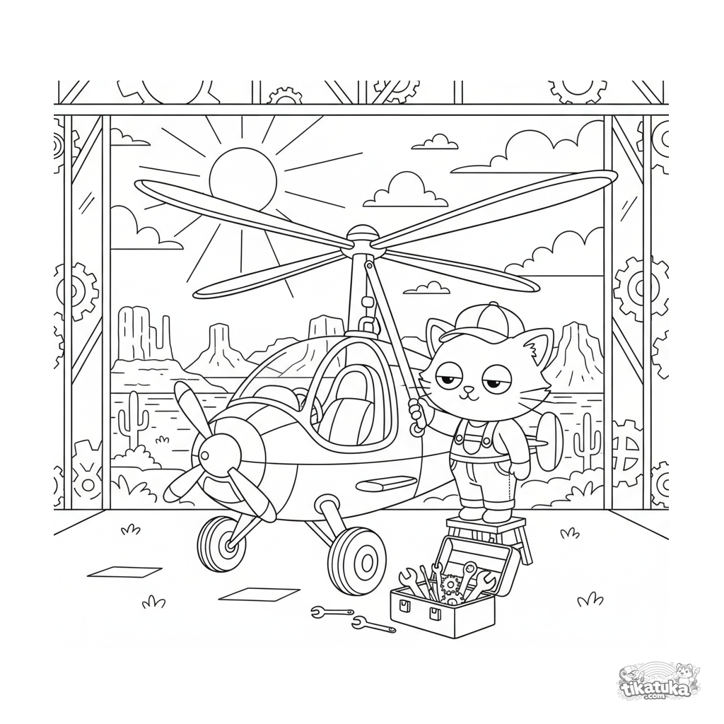 Detailed coloring page of a vintage autogyro parked in a desert hangar. For ages 10-12. A mechanic cat checks the blades, mesa in background.