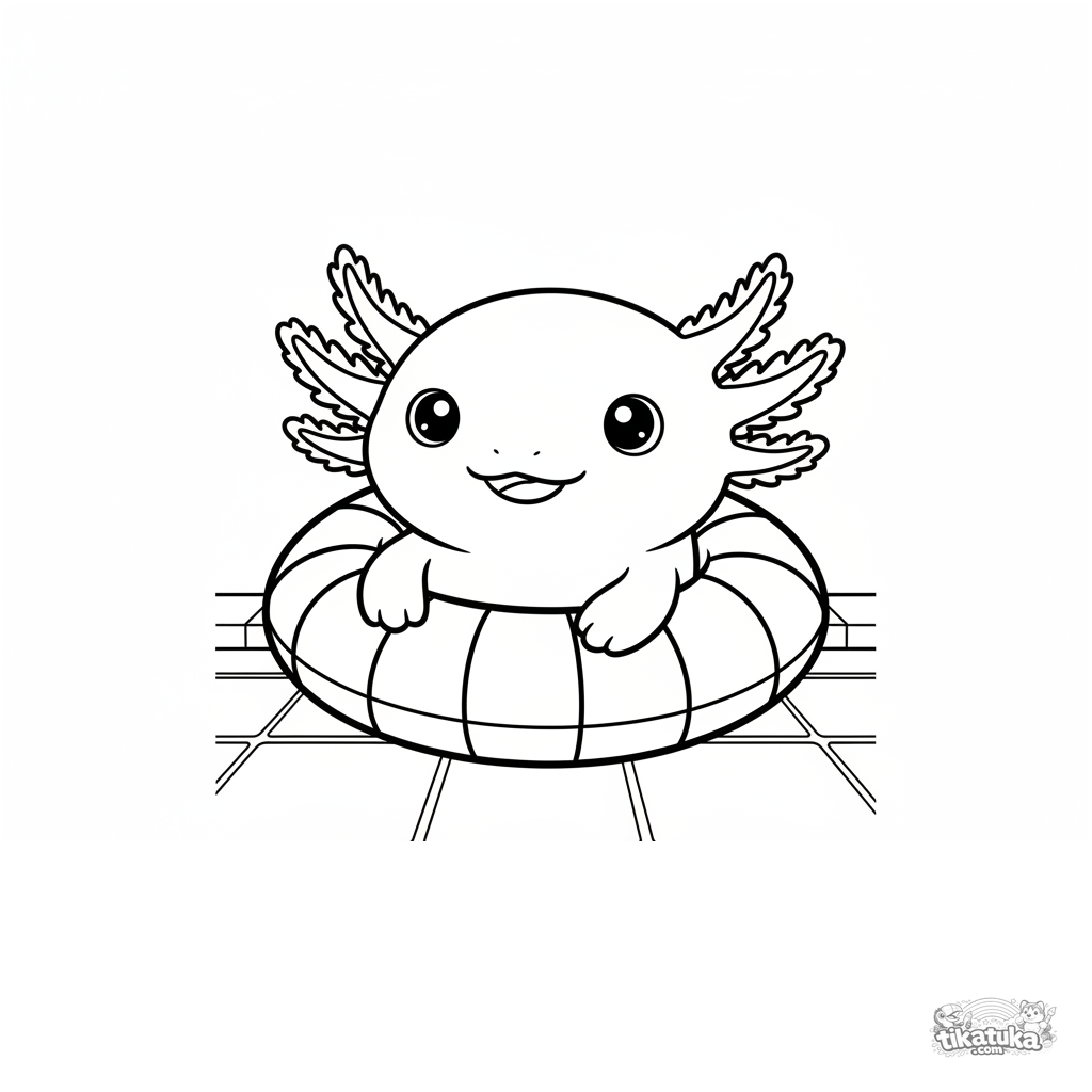 Coloring page for kids 4-6: a cute axolotl lounges in an inner tube at the bottom of a pool. Simple shapes and a sweet expression.