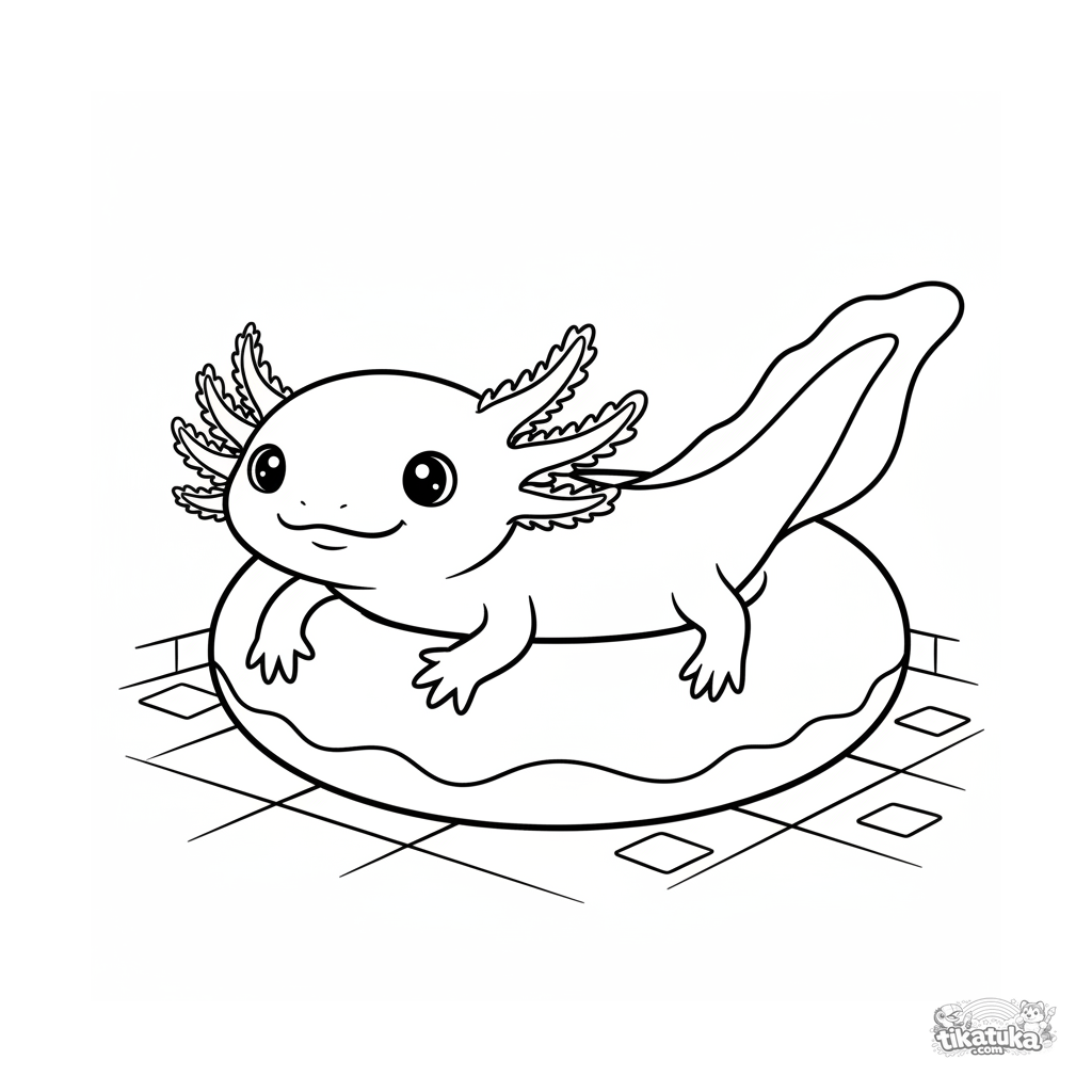 Coloring page of a cute axolotl swimming through an inflatable ring at the bottom of a pool. For kids aged 4-6. Clear outlines, friendly scene.